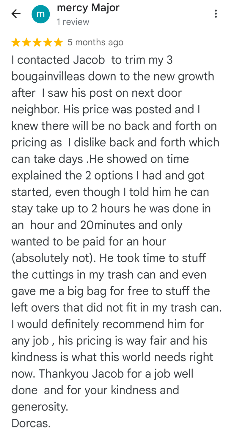 Hi, I’m Jacob Payne.Owner and operator of Sabino Cleaning and Landscaping since 2022. I got my start nearly a decade ago at The Gallery Golf Course in Dove Mountain before building my own business. Today, I take pride in delivering dependable, detail-driven service to homeowners and small businesses across Tucson.When you hire me, you’re not getting a rotating crew or a rushed job—you’re getting me, personally, every time. I take pride in delivering consistent, high-quality service with a focus on long-term client relationships.My mission is simple: leave the desert better than I found it while enhancing the value and beauty of my client’s properties. That means maintaining landscapes in a way that honors the environment, respects native beauty, and supports sustainability. Most of my tools are battery-powered—reducing noise, lowering emissions, and keeping operating costs down for both the planet and my clients.If you're looking for reliable service, honest communication, and a landscaper who genuinely cares—let's connect. I’m here to keep your space clean, beautiful, and thriving.